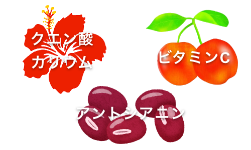 クエン酸やカリウムを含むハイビスカスエキスや、ビタミンCを多く含むアセロラ、アントシアニンを含む小豆種皮エキスを配合しました。健康維持から美容、いつも元気を応援します。